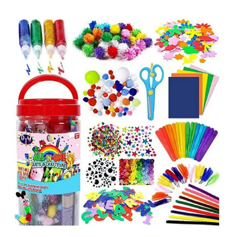 Despierta la imaginación y el talento artístico de los niños con nuestro completo Kit de Manualidades “Todo en Uno”. Este set incluye una amplia variedad de materiales coloridos y divertidos: pompones, palitos de helado, ojos móviles, limpiapipas, brillantinas, papeles de colores, tijeras de seguridad, letras de goma eva, lentejuelas y más, todo en un práctico envase con tapa para mantener cada pieza organizada.